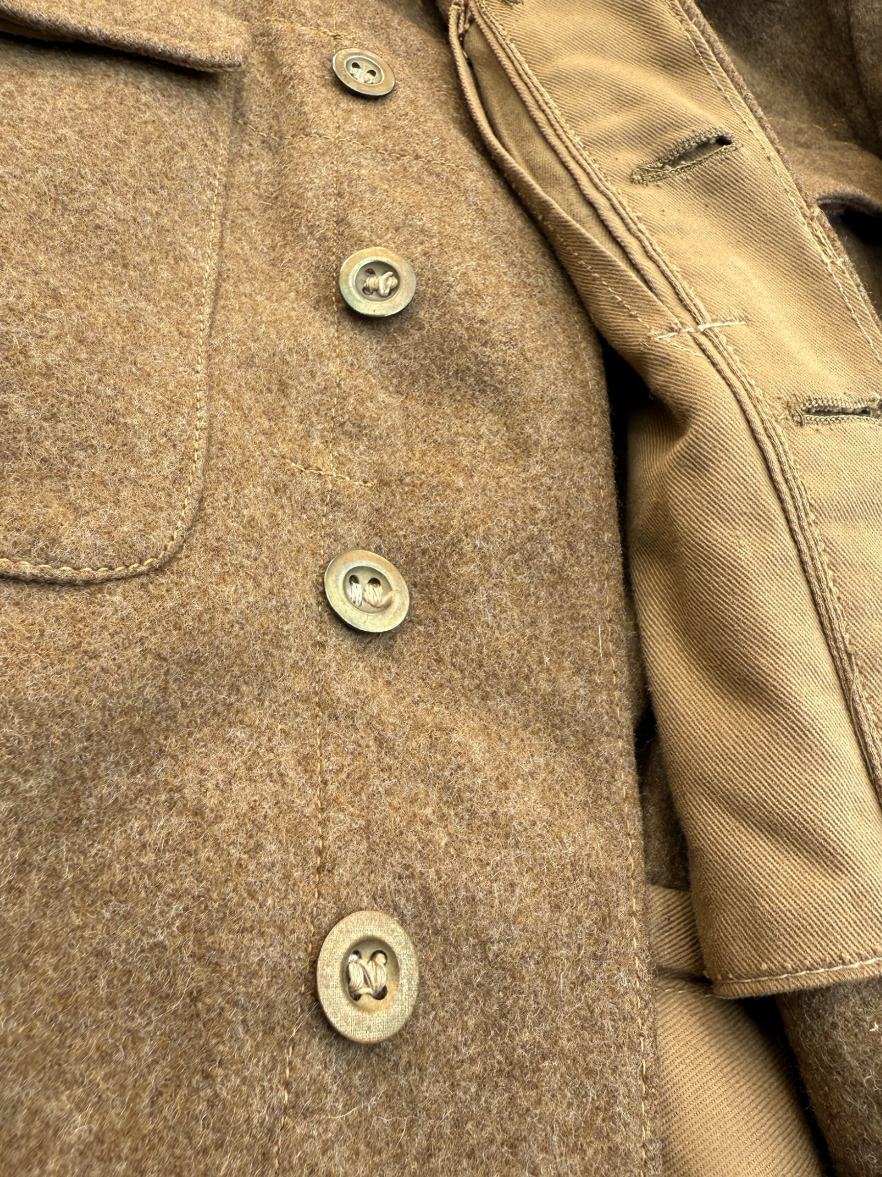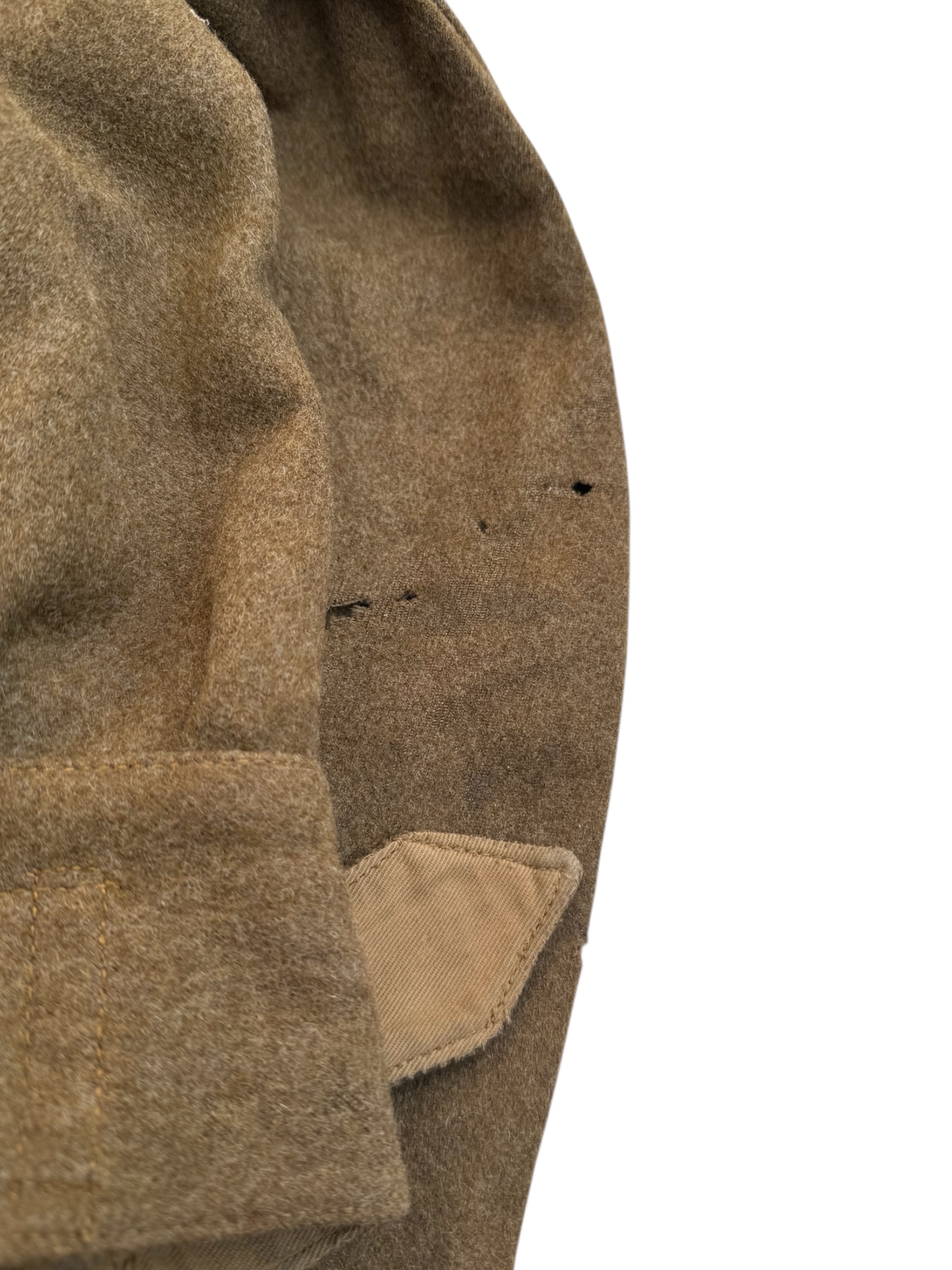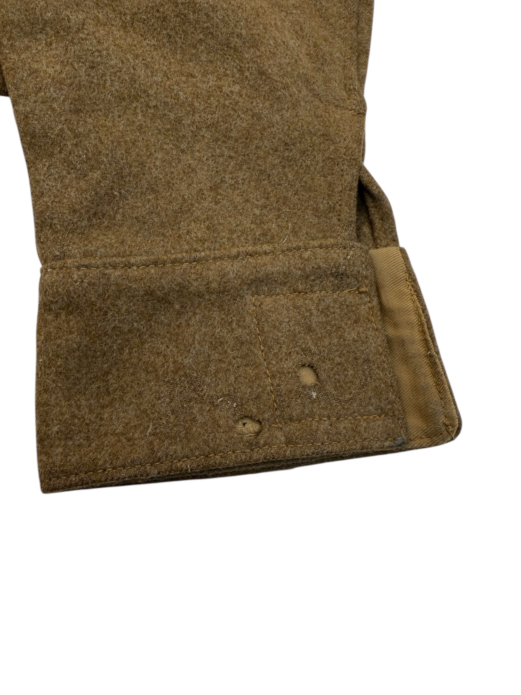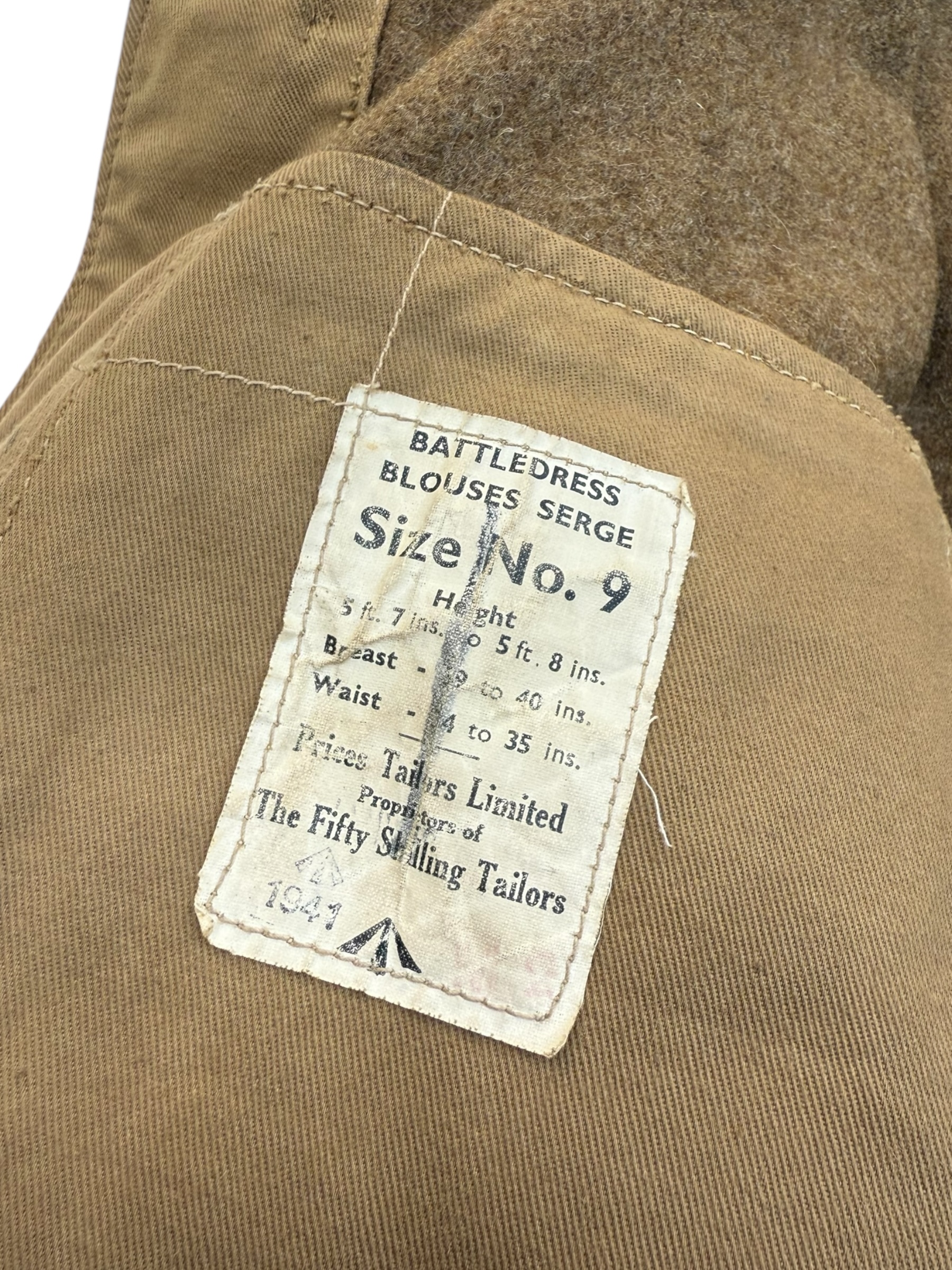 Originele Engelse WO2 41 Royal Marines Commando P37 battledress. Het betreft een Size No. 9 in nette, gedragen staat. Deze battledress is geproduceerd in 1941, wat overeenkomt met de aanwezige P War Department markering. Er is enige motschade aanwezig, dus bekijk de foto’s goed! Het voordeel is echter dat de meeste schade aan de achterzijde zit, waardoor dit bij presentatie op een buste of mannequin nauwelijks zichtbaar is.