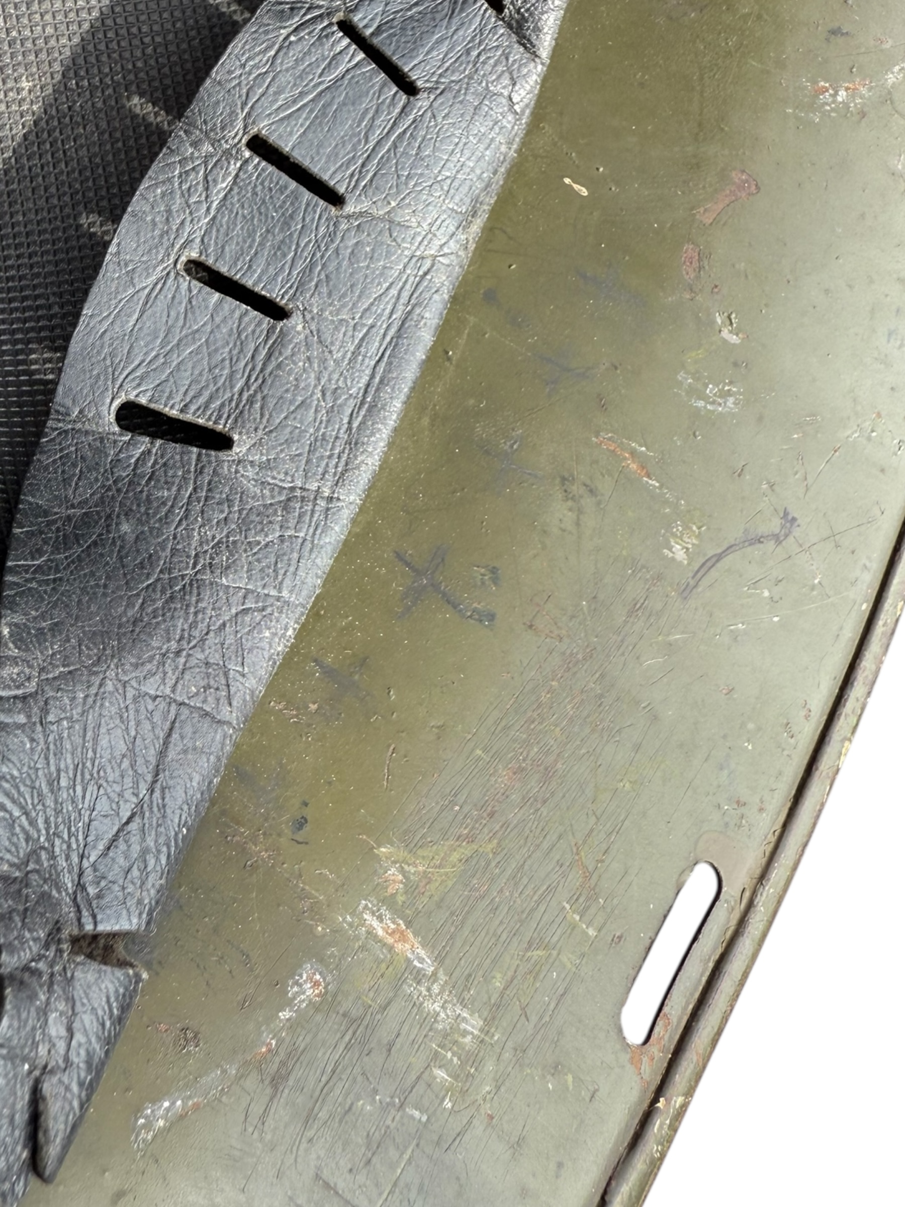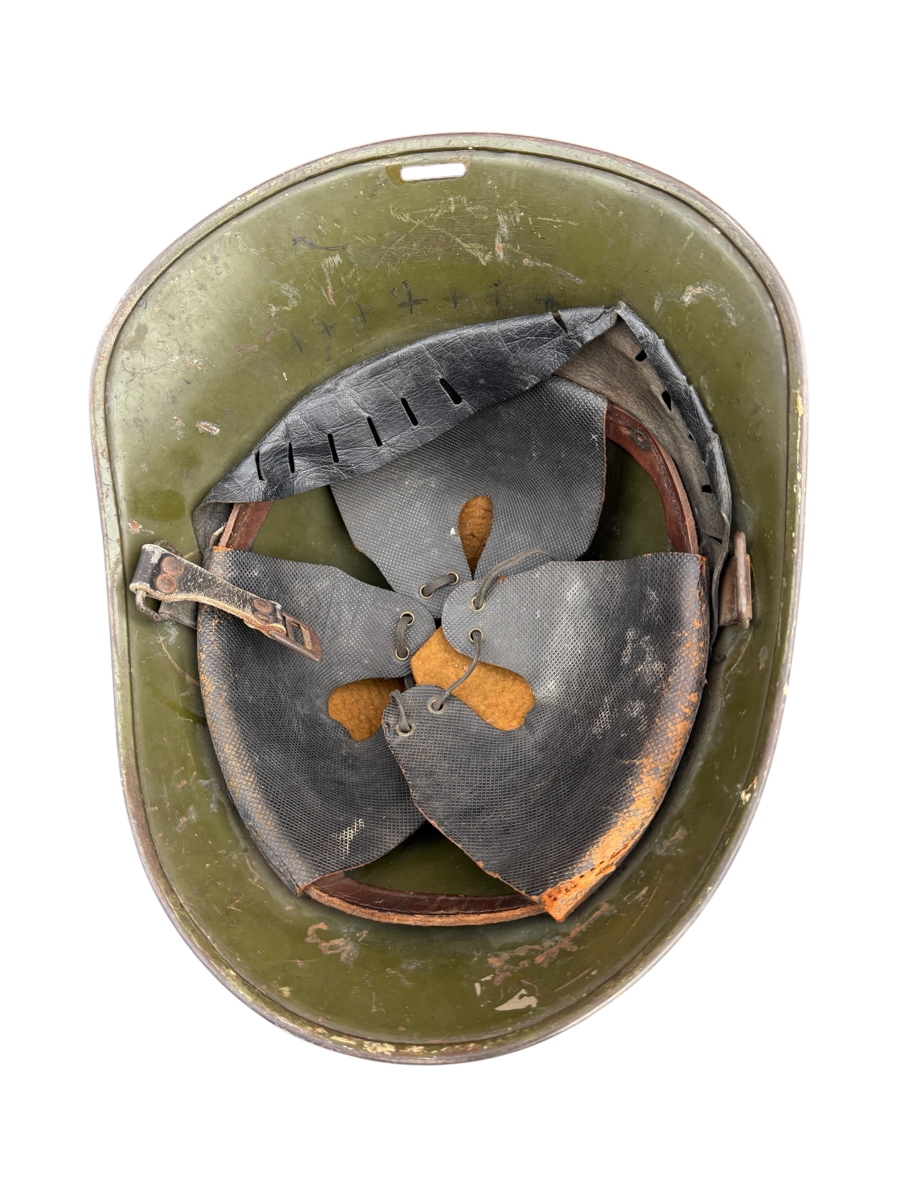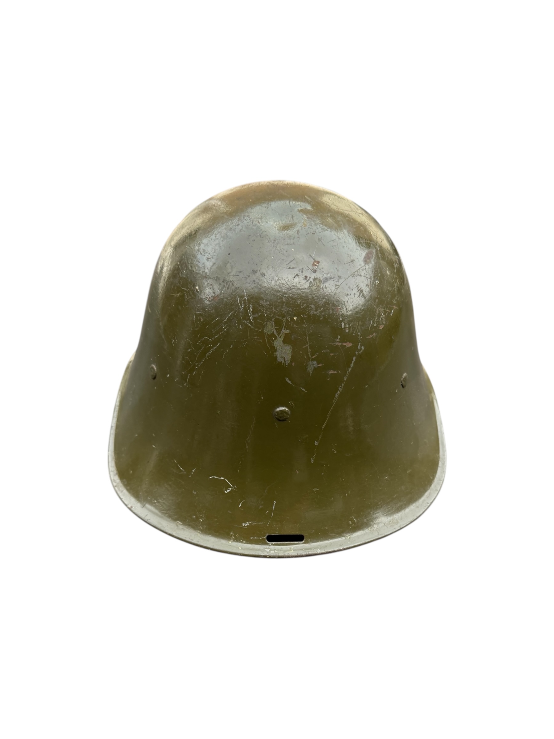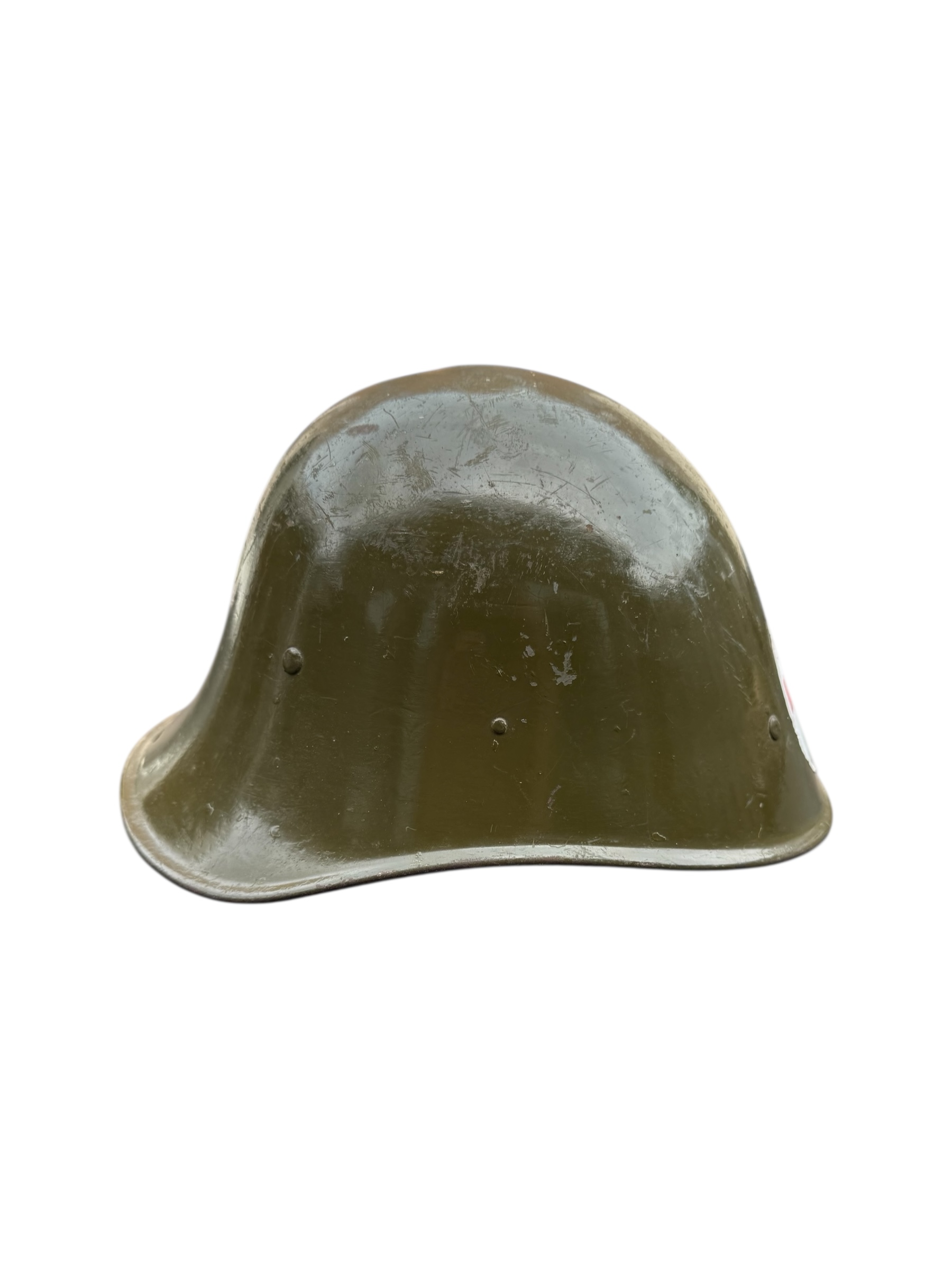 Nederlandse WO2 Rode Kruis helm in nette gedragen staat. Deze is voorzien van een bruin-groene verflaag en een handgeschilderd rood kruis aan de voorzijde. Een bijzonder en authentiek stuk met karakter.