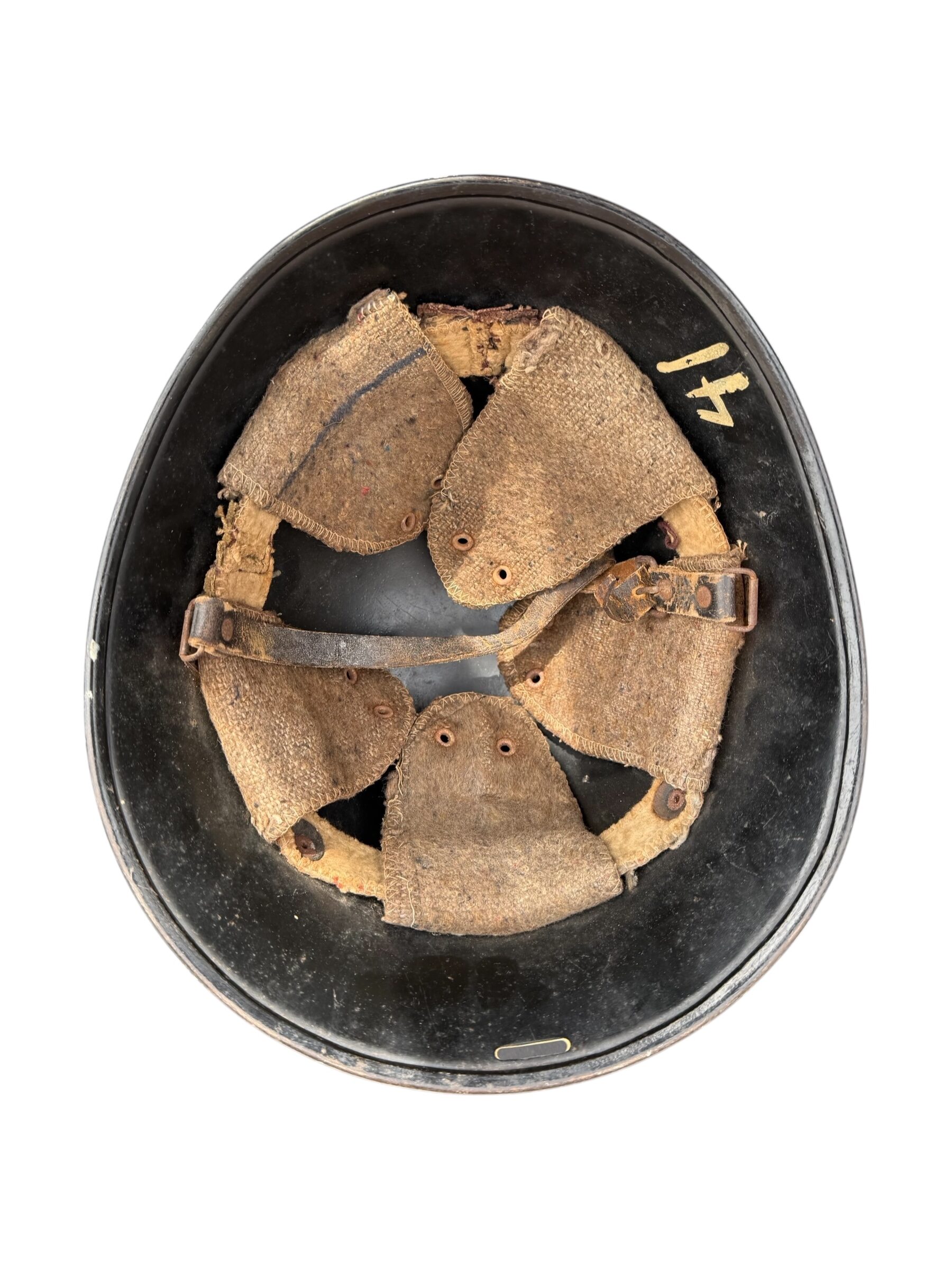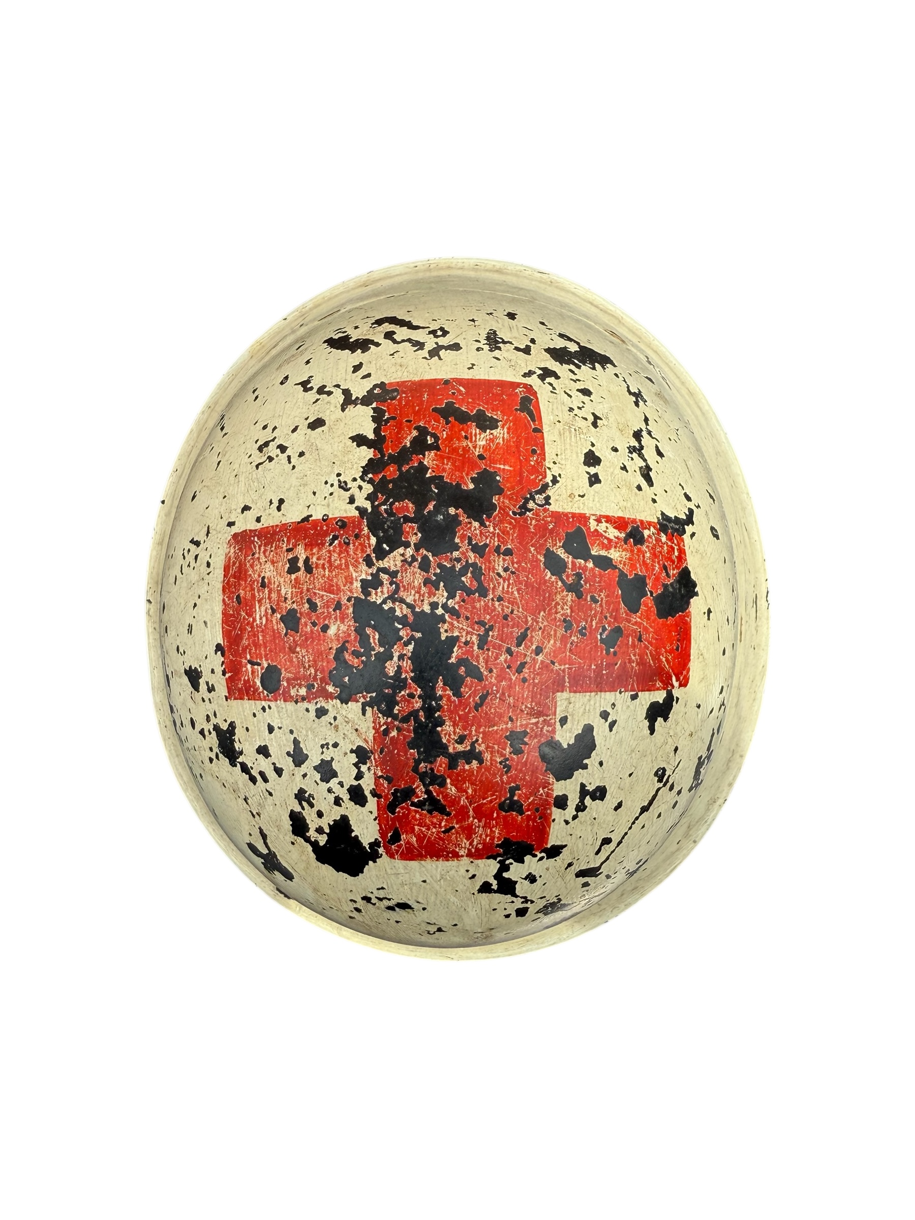 Nederlandse WO2 LBD Rode Kruis helm. Deze helm heeft een prachtige uitstraling en duidelijk zichtbare sporen van gebruik. Het merendeel van de verf is nog aanwezig, maar de lederen kinband is helaas gebroken.